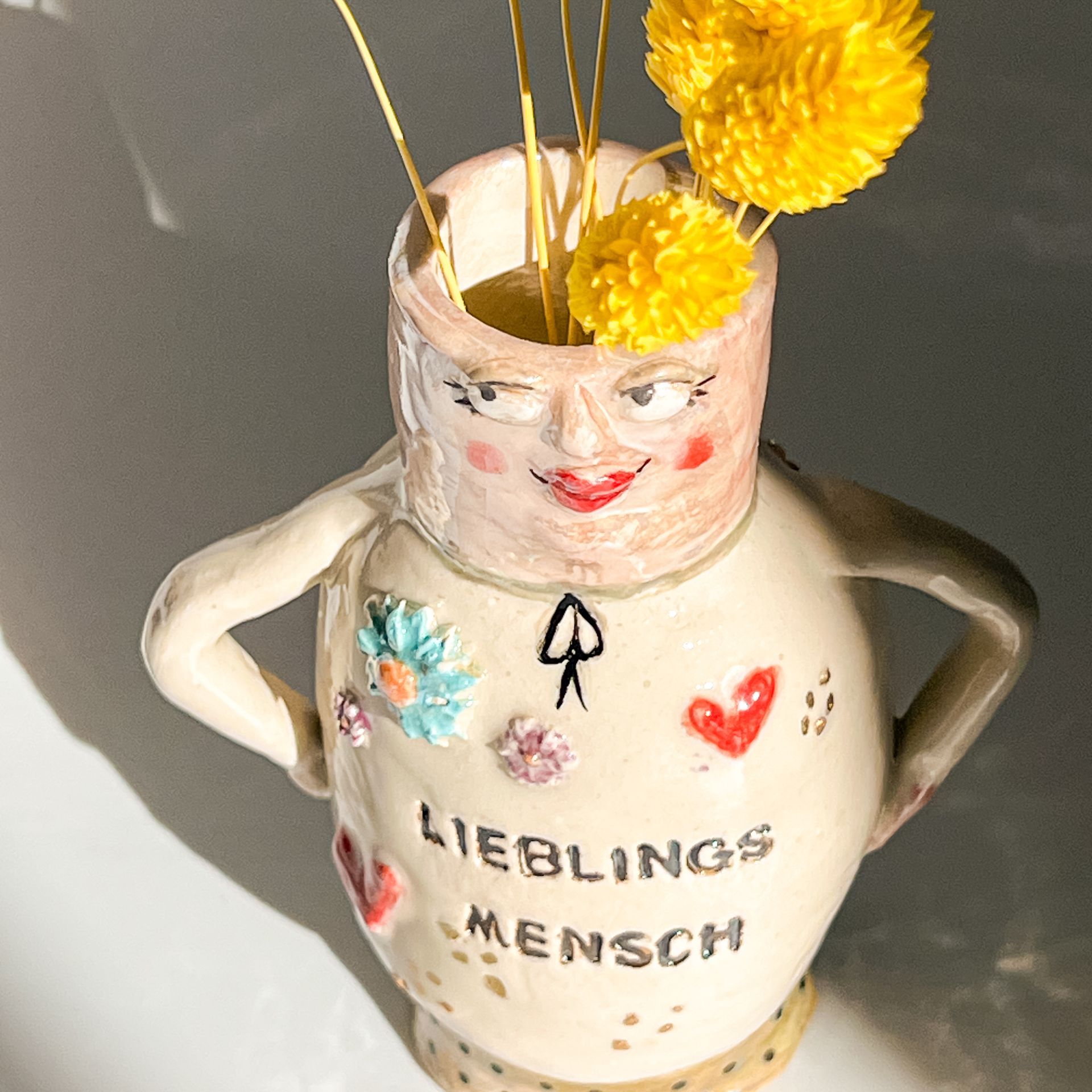 Nach der Formgebung aus dem keramischen Rohstoff sind es noch viele Arbeitsschritte, bis eine Figur den Namen "Schönliebchen" bekommt. Jedes modellierte Stück muss zunächst an einem kühlen Ort, je nach Größe, für etwa eine Woche, gut durchtrocknen. Nach dem ersten "Schrühbrand" bei etwa 950 °C beginnt die mehrstündige Abkühlphase. Das rohgebrannte Objekt wird danach von Staubresten befreit damit die Glasur gut haften kann. Ich trage die Glasur sorgfältig von Hand mit einem flachen Borstenpinsel auf. Hierfür sind drei bis vier Farbaufträge in dünner Schicht notwendig. Nach dem Glasurbrand wird aus der im rohen Zustand matten Glasurfarbe eine strahlend glänzende Oberfläche.
